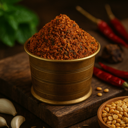 A refreshing and aromatic blend made with mint leaves, dry red chilies, cumin, garlic, tamarind, chana dal, moong dal, urad dal, and black pepper. This Pudina Karam brings a unique minty-spicy flavor to every dish.